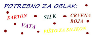 ...postupak je ovakav : iz kartona izrežete veliki oblak sa silikonskim pištoljem se pričvrsti vata, iz kartona izrežete mala srceta i par većih obojate ih u crveno i nanizate na silk, te pričvrstite za oblak od iza...